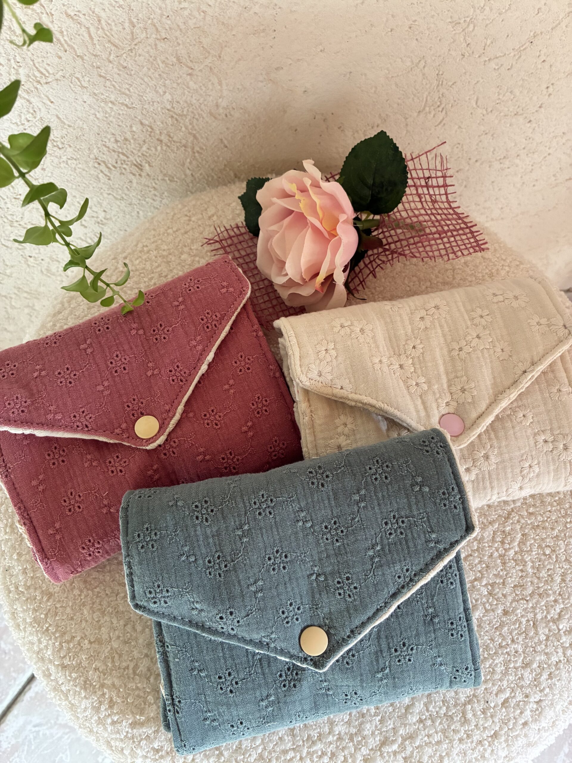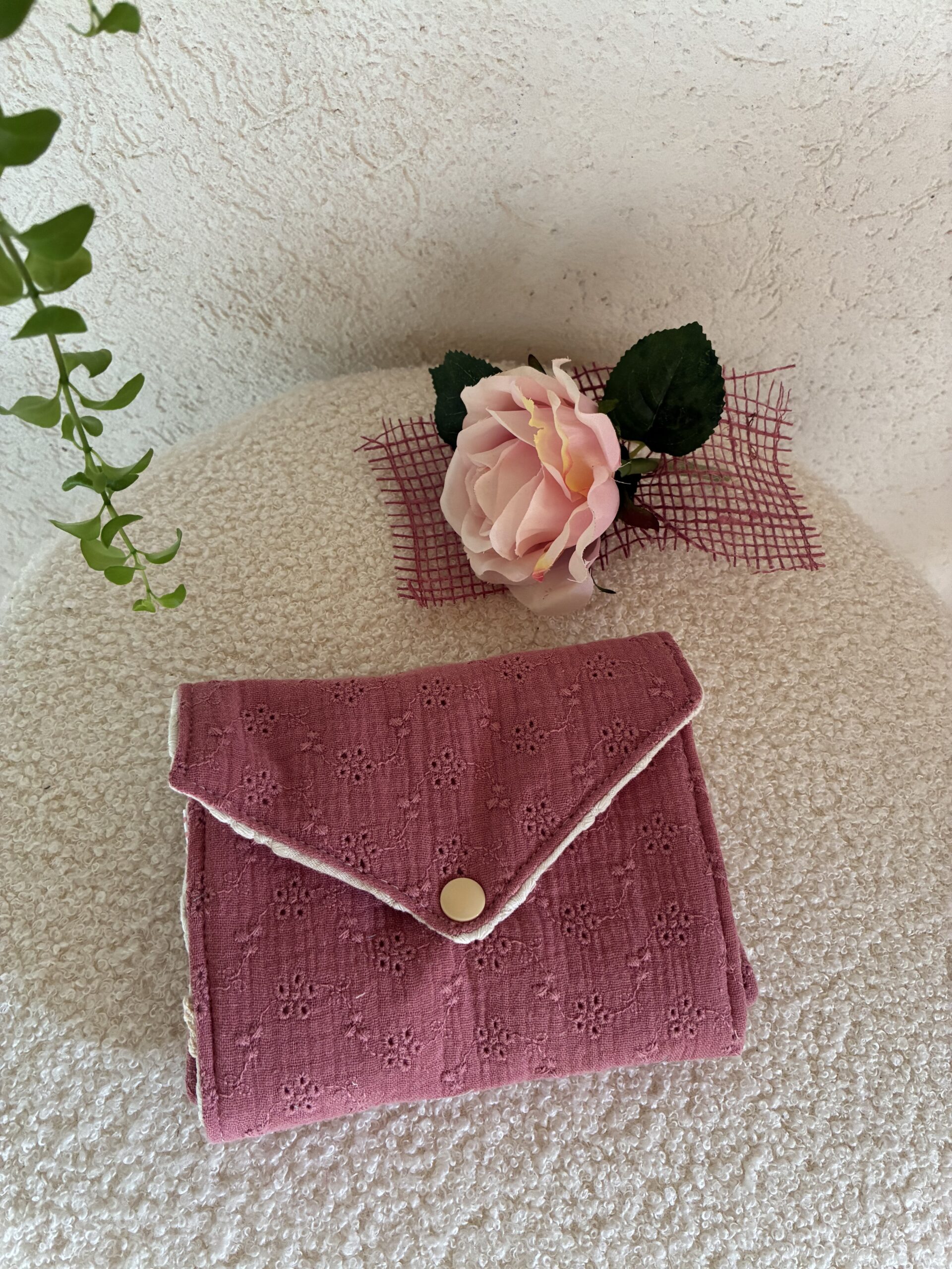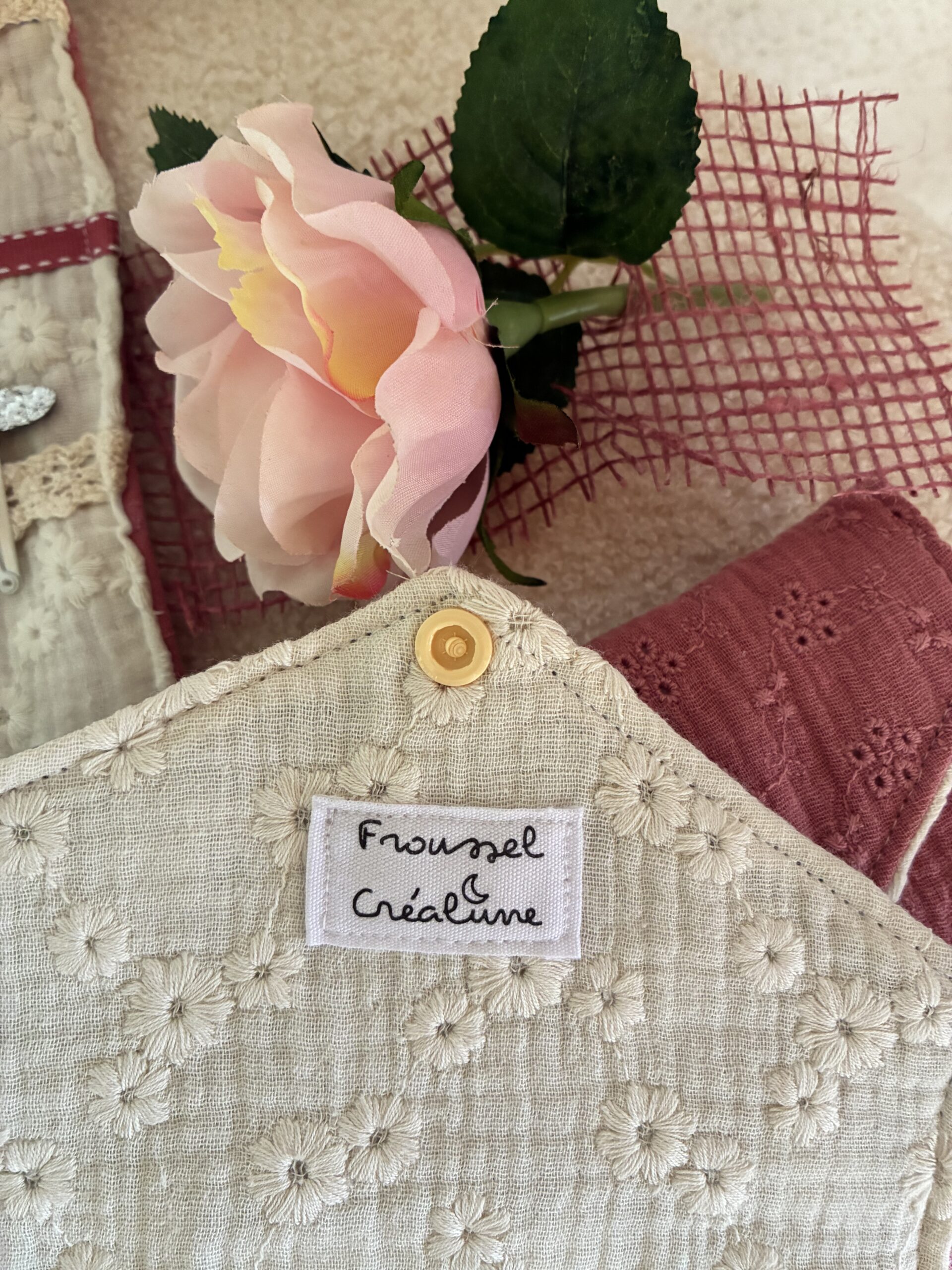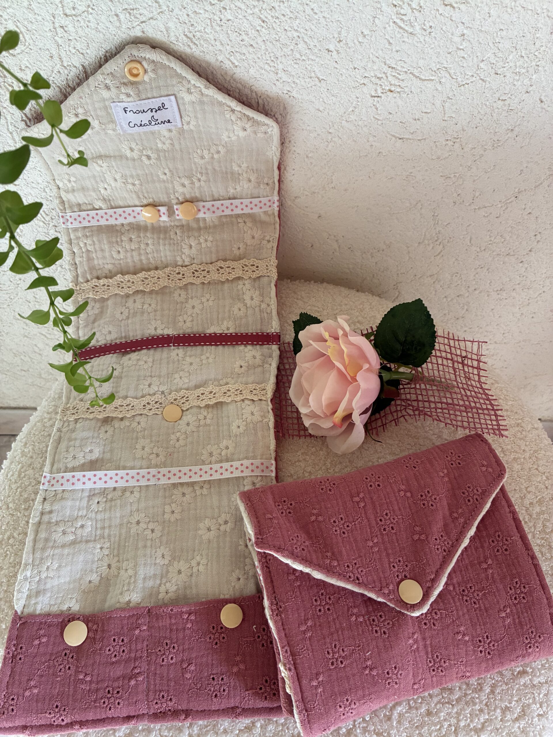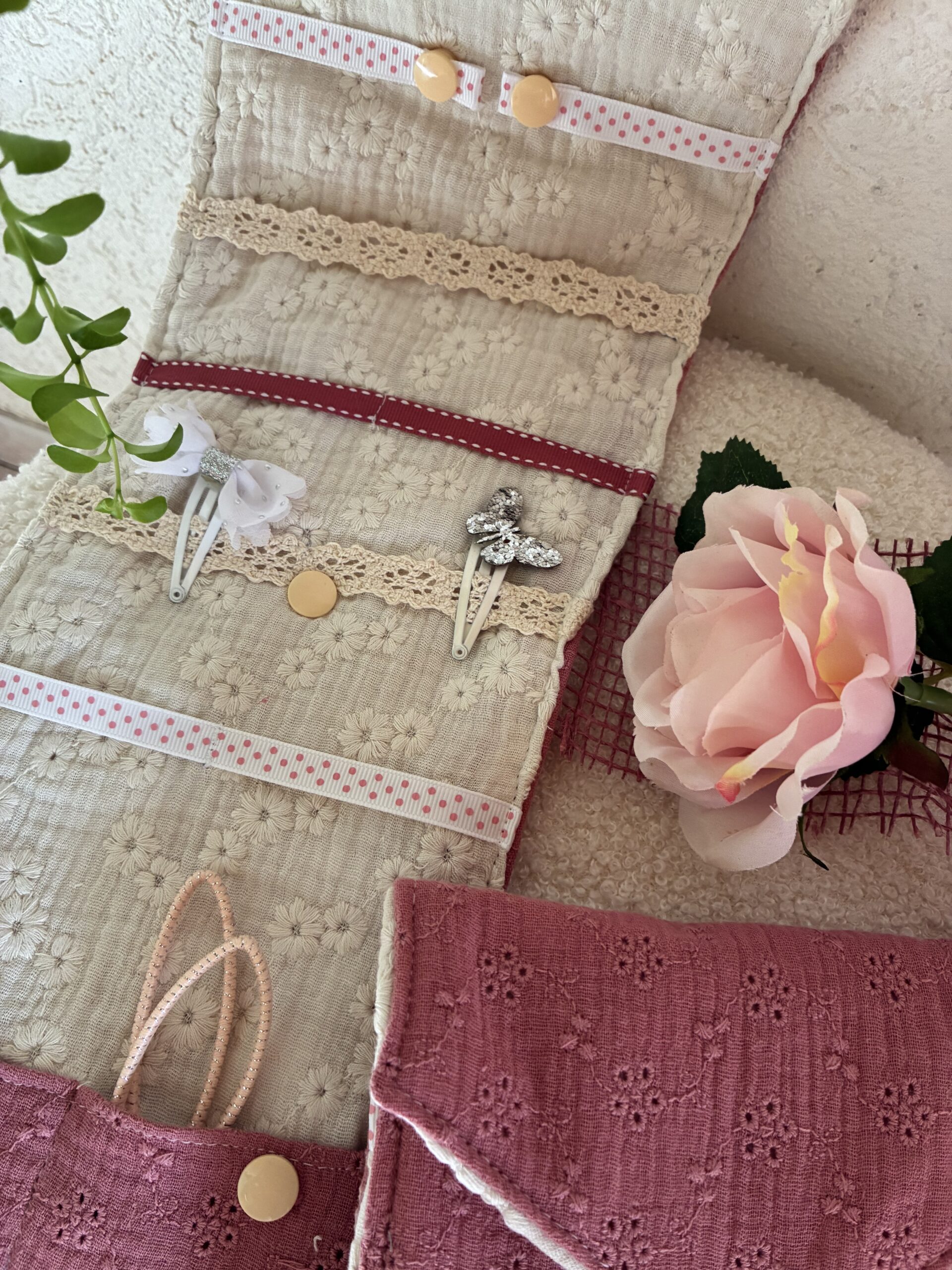 Étui barrettes et chouchous « Romantique » rose. Tissu coton broderie anglaise, matelassé fermé par une pression. Deux poches plaquées fermées par pressions. Quatre rubans qui permettent le rangement des barrettes, des chouchous des mamans et des petites filles !